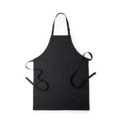 Kombinerad förkläde i bomull och polyester, tillgänglig i flera färger, med dubbel frampå ficka och justerbara remmar. Skärning under knäet.