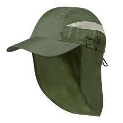 Mjuk mikrofiberkeps med tvåfärgad design, elastisk stängning, nätpaneler och en flap för att skydda nacken mot solen.