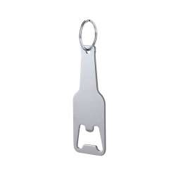 Nyckelring med flasköppnare i aluminium, praktisk och stilren.