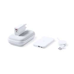 Upptäck Set Power Bank - Cody, ett komplett set av laddare utformat för att möta alla dina behov. Tillverkad av slitstarkt vitt ABS, innehåller det ett extern batteri på 4 000 mAh med integrerad trådlös laddare på 5W, kompatibel med Qi. Utrustad med en USB-utgång, en USB C in/utgång och en LED-indikator för laddningsstatus.