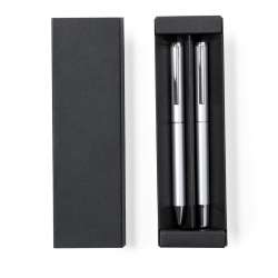 Upptäck vårt set med penna och roller i aluminium. En penna med lock och roterande mekanism, tillsammans med en roller, båda försedda med en metallklipp.