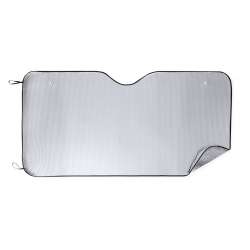 Aluminiumsolskydd med bubblor på båda sidor, metallisk silverfinish och elegant svart kant. Generösa mått på 180 x 90 cm för optimal täckning. Utrustad med robusta förstärkningsringar i metall och praktiska elastiska remmar för enkel hopfällning. Säker fäste med två medföljande sugproppar. Perfekt för grossistbeställningar, denna produkt levereras platt, redo för anpassad tryckning.