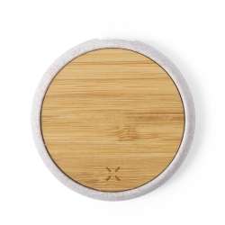 Upptäck den trådlösa laddaren med cirkulär design. Dess yta i bambu ger en naturlig touch till ditt utrymme.