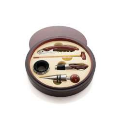 Detta kit inkluderar tillbehör i rostfritt stål och trä. En korkskruv med kapsylskärare, en flasköppnare, en kork, en hällpip, en droppskydd och en termometer.